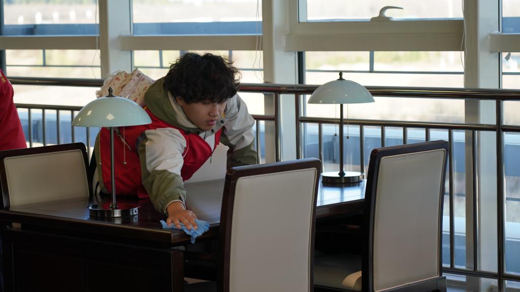 活动现场,党员同志与青马班学员们分工协作、默契配合,展现出饱满的热情与严谨的态度。大家手持清洁工具,穿梭于图书馆的书架之间与阅览区域,细致擦拭桌椅、书架、窗台等设施,认真清理角落灰尘与杂物,不放过任何卫生死角;同时有序整理散落书籍,按照分类规范将图书归位,全力为师生营造整洁有序、舒适静谧的阅读环境。