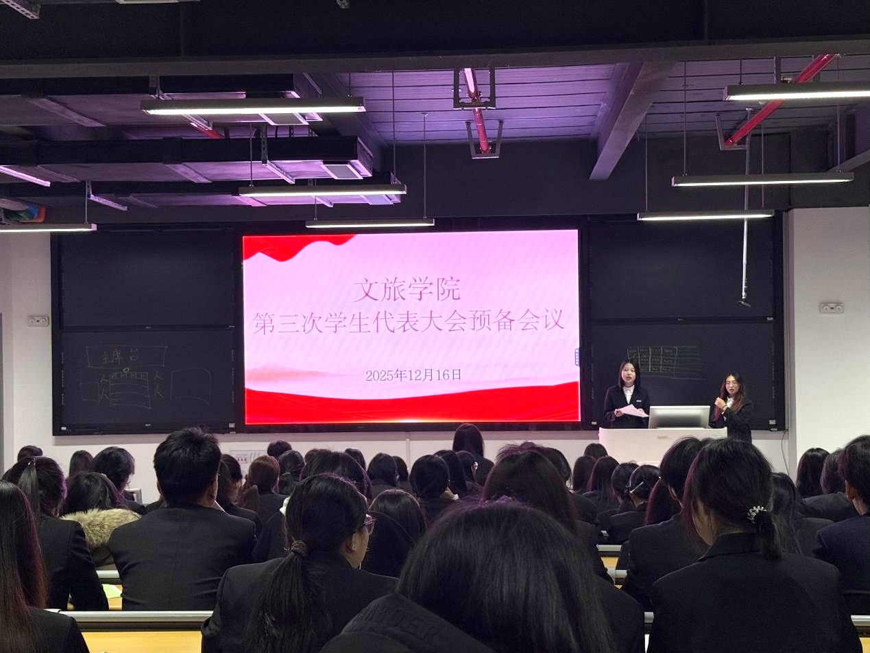 文旅学院在格物楼阶梯教室召开第三次学生代表大会预备会议,会议由学院团委副书记(学生)袁小雯主持,该会议阶段。