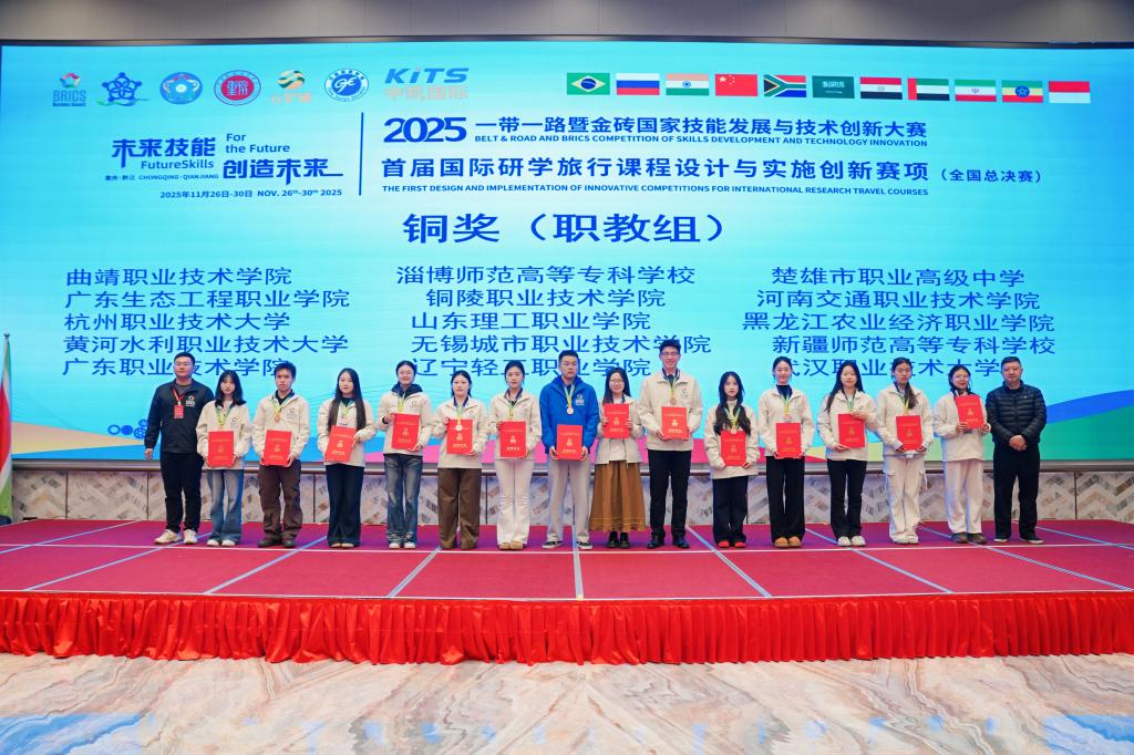近日,2025“一带一路”暨金砖国家技能发展与创新大赛首届国际研学旅行课程设计与实施创新赛项全国总决赛在重庆旅游职业学院圆满落幕。淄博师范高等专科学校文旅学院考彦霏、陈浩宇、李晨瑜、彭佳炜等四名同学组成的参赛团队,在全国122支参赛队伍、691名师生的激烈角逐中脱颖而出,凭借兼具文化深度与实践价值的创新设计斩获职教组铜奖,不仅展现了学院学生扎实的专业技能和良好精神风貌,更实现了学校在全国研学类赛事和学院研学旅行管理与服务专业在全国赛项上的双重历史性突破。