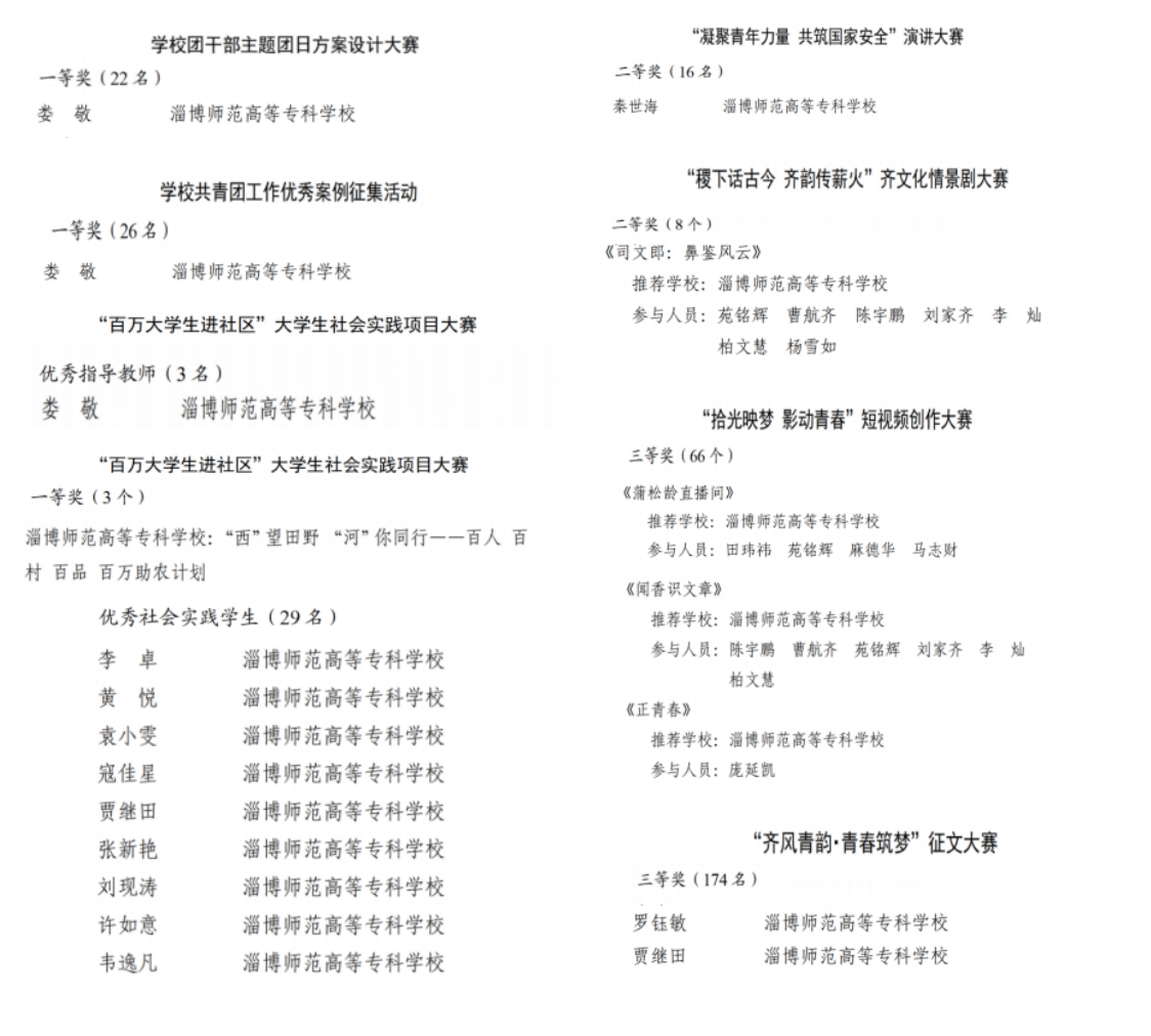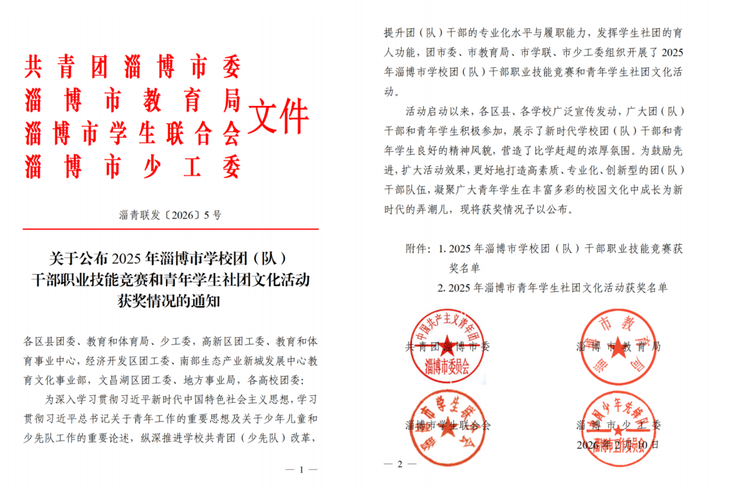 近日,共青团淄博市委等多部门联合印发《关于公布2025年淄博市学校团(队)干部职业技能竞赛和青年学生社团文化活动获奖情况的通知》。学院师生在本次评选中表现优异,斩获多个奖项:教师组荣获一等奖2项、优秀指导教师1名;学生组斩获一等奖1项、二等奖2项、三等奖5项,9名同学获评“优秀社会实践学生”称号。