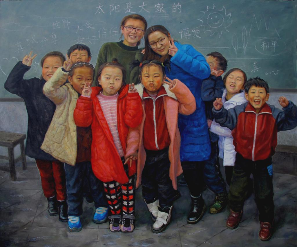 黄河文化是中华民族的根与魂,沉淀和积累了几千年来中华民族特有的物质财富与精神财富,黄河文化寄托着中华民族伟大复兴的梦想,是中华民族不断攻坚克难的精神支撑。油画作品《黄河·追梦》,创作灵感来自于黄河岸边长大的青年学生返乡实习支教的工作场景。作品采用浪漫现实主义表现手法,通过饱满的构图、艳丽的色彩、丰富的肌理等绘画语言,刻画出孩童们簇拥在支教老师身边亲密无间的感人瞬间,颂扬友谊、真情和爱。黄河儿女富有朝气,热恋故土,具有浓烈的思乡情怀。他们单纯,质朴,富有爱心的品格,与母亲河的滋养密不可分,他们积极乐观,扎实勤恳,勇于追逐自己的梦想,具有鲜明的时代特点。