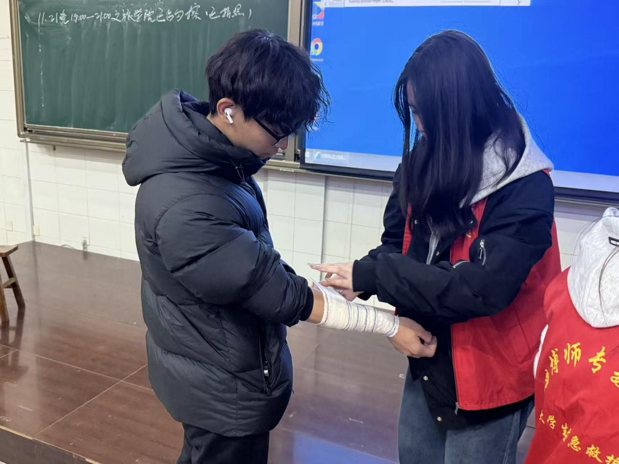 活动伊始,红十字大学生应急救护队负责人赵康宁同学首先介绍了救护队的基本情况与服务宗旨。随后,培训进入核心环节——螺旋包扎法的讲解与实操。队员们通过清晰的步骤分解,详细阐述了针对上肢、下肢等不同肢体部位的包扎技巧、操作要点及注意事项。