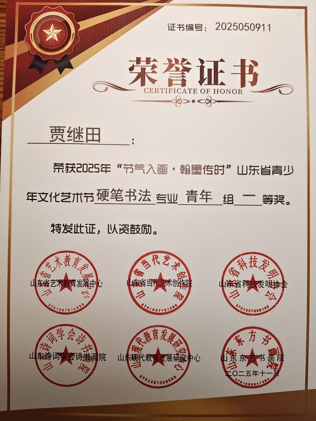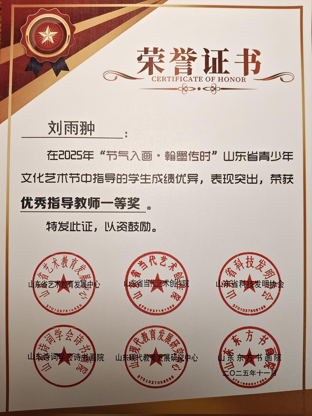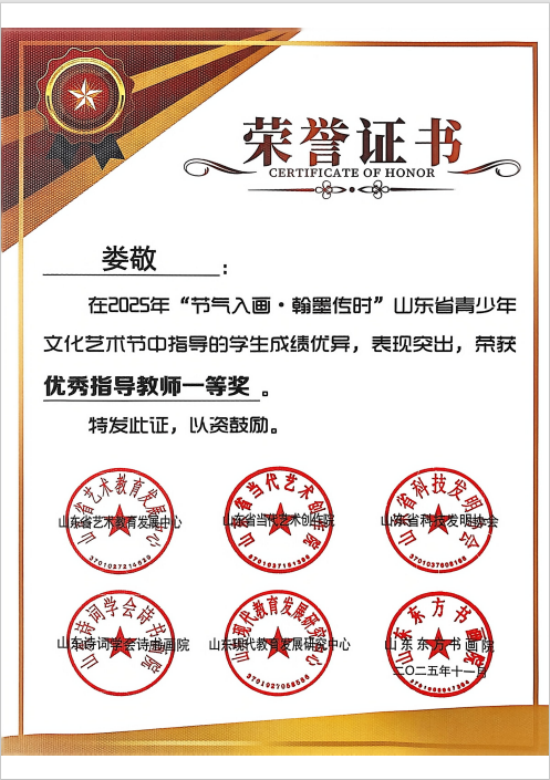 近日,2025年 “节气入画 翰墨传时” 山东省青少年文化艺术节获奖名单正式揭晓。文旅学子凭借深厚的专业素养与扎实的创作功底奋勇争先,共斩获一等奖5项、三等奖2项,娄敬、刘雨翀两位教师获评“优秀指导教师一等奖”,用实力彰显了学院文化育人的丰硕成果。